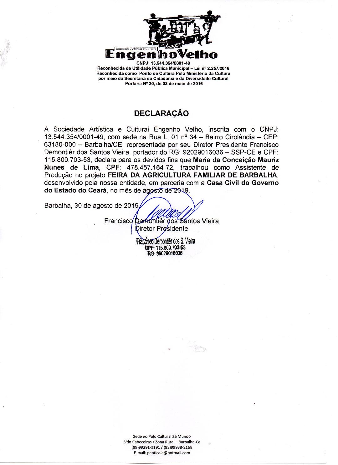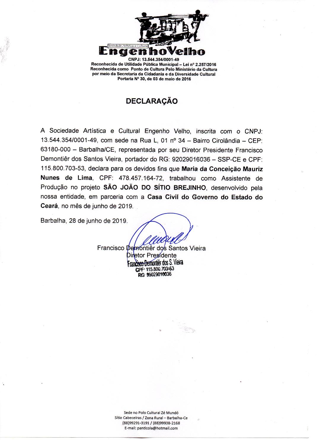 Produtora do Teatro de Bonecos Jacarandá, Circo Escola Trupe do Rizadinha na Cidade de Barbalha, grupo de tradição Caretas Pé de Serra, Quadrilha Junina de Idosos de Missão Velha . Educadora Social , confecciona e manipuladora de bonecos e brincante do grupo de tradição Caretas Pé de Serra. Trabalha com crianças , adolescentes e idosos nas Malvinas e na zona Rural de Barbalha, Missão Velha e Jardim em Situação de Vulnerabilidade Social. Pesquisadora, Oficineira e mediadora da Cultura Popular (Grupos de Tradições). Através da arte popular podemos levar o encantamento dos movimentos culturais há vários locais desprovido de oportunidades e formações de uma criticidade artística. Movimentos estes muitas vezes pelos editais que fomos contemplados e nossa força de vontade de acreditar na arte.Vídeos